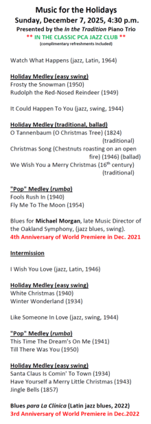UP TO DATE VACCINATIONS RECOMMENDED,                                                         MASKS STRONGLY ENCOURAGED IN MAIN HALL!                                            The IN THE TRADITION Piano Trio  PRESENTS:             (Bill Jackman - Piano,   Michael Jones - Bass,   Albert Brooks, M.D. - Drums).                                  ** IN THE INTIMATE PCA CLASSIC JAZZ CLUB **                                           (complimentary refreshments included)                                                                Music for the Holidays!      December 7, 2025,    4:30 PM