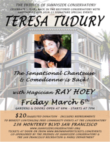 With a deep, sultry voice that magnetizes audiences, and a scathing comedic wit to match, Teresa Tudury is a consummate performer who pours out her original songs with power, verve, passion, and disarming humor. Teresa's voice has been described as a cross between Bette Midler and Bonnie Raitt (LA Weekly). Her vocal stylings are perfectly complemented by her bluesy guitar playing. Ray Hoey has been spinning his magic since 2004, and will dazzle you with his illusions and historical knowledge of magic through the ages. The Sunnyside Conservatory is the perfect place to showcase these two Sonoma County performers. Friday March 6th Doors and Gardens open at 6pm. Show starts at 7pm. $20. Free light refreshments at the intermission. To benefit free community events at the Sunnyside Conservatory. 236 Monterey Blvd. San Francisco www.sunnysideconservatory.org.