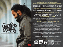 Celebrating the life and legacy of revolutionary producer/DJ/Community Activist Jammall Metaphysic Gordon @Santos Party House 96 Lafayette Street NY, NY 10013 Date: July 7th, 2011 DOORS OPEN AT 8PM 100% of proceeds will go to his family Tix: $20 advanced TIX/ more at the door *Interactive Art Workshop with Crystal Clarity and Marthalicia *Musical sets by Dj Break Beat Lou, A-Alikes, Gabre Maskal, Raye 6, UMI (RBG), Fresh Daily, Karniege (eow), Faroh Z, 5th Seal ((MPC set)), F.T., Golden Child and The Chosen, Hasan Salaam, Akir, Blazhay, Madsol Desar, Divine of the DEY, InI Mighty Lockdown, Mayhem Lauren, Jay Love, Kon Boogie, DJ PF Cuttin, and more Special invited guests Immortal Technique, M-1 of dead prez *recordings of Soundtrack Hour on pncradio.fm with Knowble and DJ Metaphysic