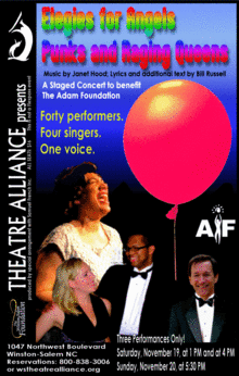 Theatre Alliance will hold this fundraiser for the Adam Foundation, a nonprofit agency that focuses on assisting agencies that heighten the awareness of the GLBT community, with a special emphasis on those who live with HIV/AIDS. ELEGIES is a song cycle with music by Janet Hood and lyrics and additional text by Bill Russell. The work features songs and monologues inspired by the NAMES Project AIDS Memorial Quilt and Edgar Lee Masters' Spoon River Anthology. Each of the monologues is written from the perspective of characters who've died from AIDS and the songs represent the feelings of friends and family members dealing with the loss.