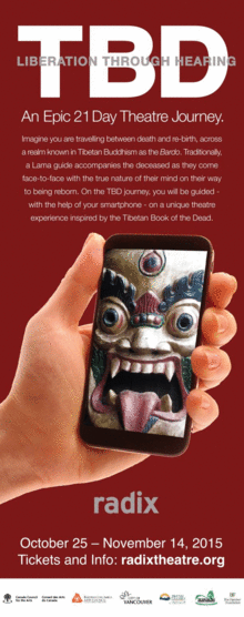 Radix Theatre presents TBD, a three-week epic journey into the possibilities of theatre and smart-phone technology, inspired by The Tibetan Book of the Dead.