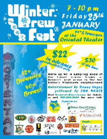 Where: Oriental Theater (44th/Tennyson-Northwest Denver) When: January 25, 2008 7-10 pm What: Warm up while sampling some of the finest winter brews in voted "best up and coming venue in Denver" $22 advance, $30 at the door.