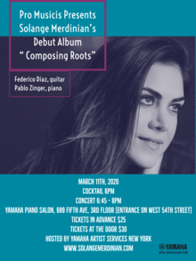 Singer Solange Merdinian's Official Debut Album Concert "Composing Roots" in collaboration with guitarist Federico Diaz, and pianist Pablo Zinger.