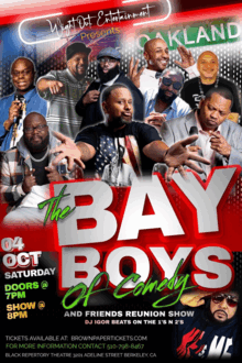 Wight Out Ent Presents The Bay Boys of Comedy and Friends Reunion Show with a Live Band. Saturday October 4th at 8pm doors open at 7pm inside of the Black Repertory Theatre 3201 Adeline st. in Berkeley, CA. Hosted by Wight Out starring Jay Rich, Big Tree, Antwan Johnson, Ricco Da Great, Leon Gibson, Poke, Lil Tone, Nuf Ced and Jerrell Parker. Dj Igor Beatz on the 1s and 2s. Food, Vendors, Raffles and Funny. General $25 VIP Seats $50 VIP Tables $200-250. For more info contact Wight Out at 510 798-8467