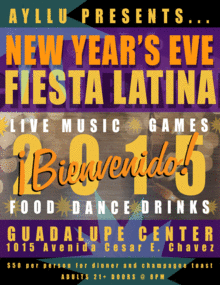 Doors open at 8 Live Music by Ayllu + Special Guests Live DJ Authentic Latin American Food Silent Auction Games Native rituals Dance Confetti, Midnight Toast and Party Favors Gringos Welcome!