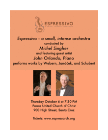 Conducted by Michel Singher and featuring the leading professional instrumentalists in Santa Cruz at its core, Espressivo -- a small, intense orchestra -- presents select masterpieces of classical music composed for a baker's dozen or so of players.