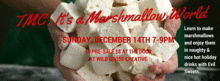 TMC and Evil Sweets Gourmet Marshmallows are excited to bring you into a Marshmallow World at Wild Goose Creative Sunday, December 14, 2014 from 7-9:00PM. Celebrate the season with us and learn how to make your own homemade marshmallows from Columbus's foremost marshmallow experts.