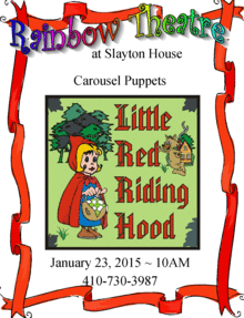 Rainbow Theatre at Slayton House will continue this season's series with the ever popular Carpousel Puppets performing "Little Red Riding Hood" on Friday, January 23, 2015. Just how bad is the Big Bad Wolf? Does he make a meal of Little Red Riding Hood? To find out, you'll have to join us in our latest production, a fun re-telling of a classic story that has been enjoyed by children for generations. Cheer as Little Red Riding Hood, Grandma and Bob the Cat get the best of the Big Bad Wolf in this funny, musical show. Find out what really happened in this tale told with new hand and rod puppet creations from Carousel Puppets! Fun for all ages. The puppet show is at 10:00am in the Slayton House Theatre in the Village of Wilde Lake in Columbia. Tickets may be purchased for $5 each and may be available at the door; exact cash or check only, Credit cards may be used at BrownPaperTickets.com, keyword Rainbow Theatre, no reservations, no refunds. Group rates. For information call 410-730-3987. Sponsored by Wilde Lake Community Association. For a copy of this season's brochure email wlevents@columbiavillages.org.