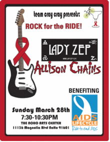 One night only! Lady Zep and Allison Chains rock out to support Team Cray Cray & AIDS/LifeCycle. Come for the music, come for the cocktails, come for the raffle. We have over $5000 in prizes to give away: