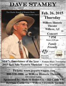 Dave Stamey is coming to the beautiful Willcox Historic Theater for the first time! Dave is a delightful and award winning cowboy/western singer and songwriter currently living in California. Just recently, (11/15/14), Dave won the Entertainer of the Year Award through the Western Music Association - this makes his 7th win! Through the WMA, he has also won Songwriter of the Year 5x and Male Performer of the Year 6x. Dave was recently honored by True West Magazine as the Best Solo Western Musician - Reader's Choice 2015! Cowboys and Indians Magazine calls Dave the "Charlie Russell of western music". Dave is a full time entertainer/singer/songwriter and is currently working on his 11th CD. Dave's music is fresh, spellbinding and fun for the whole family. His music has been called "contemporary western music" as it sparks joy in the heart of the audience who live and/or love to experience the "West".