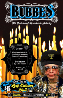 Bubbe's Old-Fashioned Hanukah Shinding 12/20, 7p-12:30a $15 adv, $20 Day of Show (Volunteers needed!) Leif Erikson Hall: 2245 NW 57th St, 98107