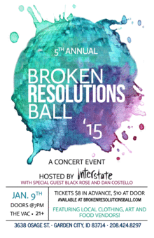 Already excited to break your New Year's Resolution? Well for the fifth year in a row, folk-rockers Interstate are hosting the Broken Resolutions Ball, at the Visual Arts Collective on January 9th! Just like in years past, the 2015 BRB will have something special for everyone to enjoy, starting with Idaho singer/songwriter and guitarist Dan Costello (hearcostello.com), a master of all three crafts. Followed by the very special reunion of part of Boise's rich music history, the "classic rock" band Black Rose will be getting back together to play some of their favorites from the catalogs of the Doobie Bros, Fleetwood Mac, and many others. Then, the BRB will send you back in to 2015 with Interstate and their roots-driven harmonies and upbeat familiarity that has made then a true northwest original. So come enjoy some local food, drinks, art, and clothing as we bring vendors from all over the city to share in Boise's longest running post-holiday event! Times and ticket details available at BrokenResolutionsBall.com.