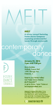 Melt: A Winter Concert will feature seventy six dancers performing a roadmap of twelve fluid phrases, each comprised of movement with different textures and elements relating to green themes such as climate change and sustainability.