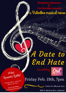 Get "out" for a Valentine's date night to benefit Out Boulder's essential and effective LGBTQ programming and advocacy! The Broadway Boomers will be performing a multitude of classic Broadway showtunes, as well as some you may never have heard before!
