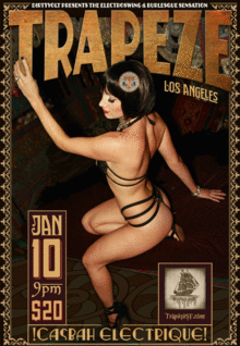 High above the burning sands of the Garment district's exotic market bazaar lies a secret oasis of seductive decibels and undulating desires that slay silent film bedouins and bass-bouncing breezies alike. The west coast's celebrated gold standard in electro-swing super cargo bellies up once again with a bright and shiny new battery of blue chip burlesque and high voltage burlectro squeezed booty-first into the Syrup Loft's throbbing alcázar like a swollen cobra caught in a lightning calliope.