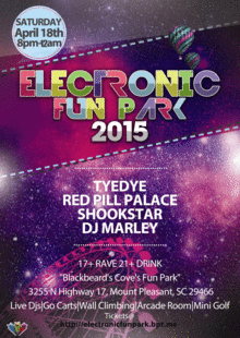 Rage Stars has decided for spring 2015 to take you on our first ever infused electronic event at a amusement fun park. We've partner'd up with "Black Beard's Cove Fun Park" for one whole night & turning it into one intense electronic dance experience along with the fun attractions. Prepare yourselves for an adventure with not only raging to some of the best electronic DJ artist in Charleston but now having unlimited access to a fun park in & outside as well. Whether you're your riding the go carts while lasers light up the course or wall climbing to the sky you'll have endless opportunities to go wild with. There will be a big dance area where the djs will be set up near the stage along with other sound & lighting production. Don't miss this first ever "ELECTRONIC FUN PARK" experience! BUY ONLINE & SAVE AT THE DOOR.