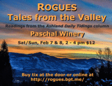 Saturday and Sunday, February 7 and 8, at 2:30 p.m., Actors read scenes from the Ashland Daily Tidings column, "Rogues: Tales from the Valley" with an audience discussion with the author afterwards. Tickets are $12, at the door and online at http://rogues.brownpapertickets.com