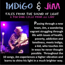 |  | EventThe Nugget Fringe Festival -- Indigo & JimIndigo & Jim- Tales from the sound of light, a ten song cycle from J.J. Cady. Passing through a new town, Jim, a wandering vagrant struggling through life with issues of health, poverty, addiction and loneliness, meets Indigo a kid, who touches Jim in ways he never thought possible. Throughout the 10 songs, Jim experiences a higher vibration and learns to shine his light in a much brighter way.