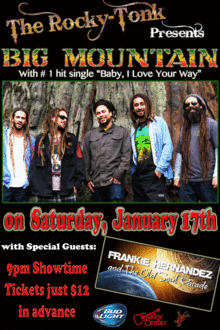 American Reggae band Big Mountain will be performing a rare, up-close and personal small venue show at the Rocky-Tonk Saloon in Medford Or. With the recent release of Two new albums, Big Mountain has embarked on their 4th extensive world tour. They have had several charting hits worldwide, their most famous being their rendition of 'Baby I love your way", which has been the most played 'non currently charting' song on radio stations throughout the world each and every day for the last 19 years. Opening the show will be Frankie Hernandez and the old soul parade. Tickets are just $12. Show starts at 9:00. 21+