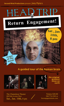 Joey Pipia's HeadTrip plays for one night only January 10th, 2015. The Chameleon Theater is an intimate venue, and tickets sell out quickly. Tickets can be purchased online at brownpapertickets.com, or by calling 360-774-2202 for reservations. More information can be found about Joey Pipia at www joeypipia.com.