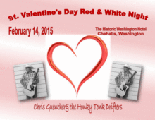 Join Chris Guenther and the Honky Tonk Drifters with special guests at the Historic Washington Hotel, downtown Chehalis on Valentine's Day (February 14th) for an evening of dining and dancing. Wear your favorite red and white. Ticket includes: music, Prime rib or Chicken Cordon Bleu (with soup, salad, potato, vegetable, bread, and dessert). Complimentary champagne, flowers provided, and Country dance lessons Come dance on one of Lewis County's finest dance floors and come join us for a night to remember.