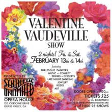 Synthetic Unlimited presents their popular Valentine Vaudeville Show on Friday and Saturday, February 13th and 14th with beautiful burlesque dancers, vaudeville comedy, live jazz music, delicious desserts, wine, drink specials, and late-night dancing. Doors open at 7:30 pm, the vaudeville show starts at 8 pm and goes late at the Synthetic Unlimited Opera House at 120 Joerschke Drive. Jewelry and roses for sale. Tickets are $25 and coming soon to www.syntheticunlimited.org, and The Briar Patch. Make reservations at 1-888-95-SHOWS.