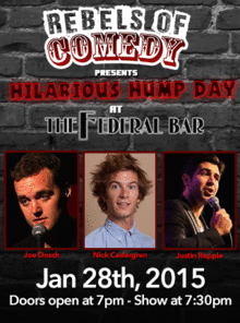 Rebels of Comedy presents Hilarious Hump Days at the Federal Bar in North Hollywood. Come out and see a night of live comedy, featuring an awesome lineup of professional features and headliner comedians. Hosted by Joe Dosch, with the show's headliners : Nick Cedergren and Justin Rupple.