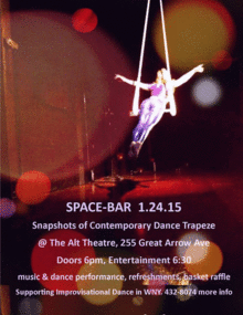 Dancers, aerialists, and musicians have joined forces to create this unique event, integrating contemporary dance with dance trapeze. The highlight performance is part of an evening of merriment with the goal of raising funds to support improvisational dance in the Buffalo area, as well as dance scholarships.
