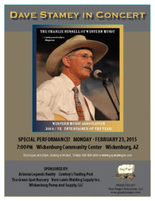 Dave Stamey returns to Wickenburg, AZ for a one night special performance! Dave is a delightful and award winning cowboy/western singer and songwriter currently living in California. Just recently, (11/15/14), Dave won the ENTERTAINER OF THE YEAR Award through the Western Music Association - this makes his 7th win! Through the WMA, he has also won Songwriter of the Year 5x and Male Performer of the Year 6x. Dave was recently honored by True West Magazine as the BEST SOLO WESTERN MUSICIAN - Reader's Choice 2015! Cowboys and Indians Magazine calls Dave the "CHARLIE RUSSELL OF WESTERN MUSIC". Dave is a full time entertainer/singer/songwriter and is currently working on his 11th CD. Dave's music is fresh, spellbinding and fun for the whole family. His music has been called "contemporary western music" as it sparks joy in the heart of the audience who live and/or love to experience the "West".
