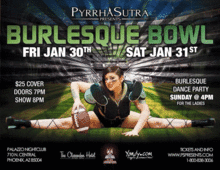 Pyrrha Sutra is proud to present "Burlesque Bowl" a night of football themed burlesque acts! Featuring dancers, comedians, contortionists, acrobats, aerialists, fire performers, and much more! Kick off your big game weekend with these sultry football babes and stay to dance the night away as the venue turns into a nightclub! 21+ only