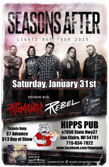 Seasons After brings their high energy show to Hipps Pub with Special Guests: Romantic Rebel and TBA! Seasons After is best know for their Hit Song "Cry Sister Cry". This is a 21+ Show and for more info call (715) 834-7822.