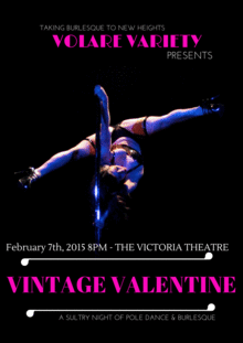 Enter a new realm of burlesque as Volare Variety once again takes over the Mission's Victoria Theatre. Featuring spectacular pole dancers, a fabulous drag queen, and some risqué burlesque routines, it's an intoxicating blend of sensual dance, eye-popping athleticism and gorgeous costumes. Perfect for your adventurous Valentine's date or your anti-romance group of girlfriends! Doors open at 7pm. Show begins promptly at 8pm so please arrive early.