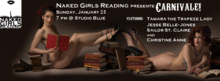 The naked girls will read stories of circuses, carnivals, carnivale festivities, and all manner of topsy turvy big top and sideshow tales in celebration of the new year and the festive season leading up to Mardi Gras.