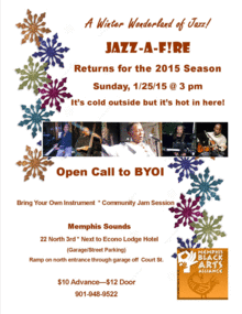 Dear Friends You, Your Friends & Family are invited to join us the last Sunday of the month, January 25, 2014 for Jazz-A-F!RE at 3-5 pm at Memphis Sounds, downstairs at 22 North Third Street at Econo Lddge Hotel. For the stair-challenged there is a ramp off the parking Garage north entrance on Court Street.