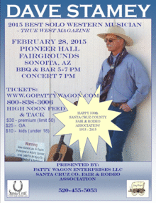 DAVE STAMEY is a delightful and award winning cowboy/western singer and songwriter currently living in California. Just recently, (11/15/14), Dave won the ENTERTAINER OF THE YEAR Award through the Western Music Association - this makes his 7th win! Through the WMA, he has also won Songwriter of the Year 5x and Male Performer of the Year 6x. Dave was recently honored by True West Magazine as the BEST SOLO WESTERN MUSICIAN - Reader's Choice 2015! Cowboys and Indians Magazine calls Dave the "CHARLIE RUSSELL OF WESTERN MUSIC". Dave is a full time entertainer/singer/songwriter and is currently working on his 11th CD. Dave's music is fresh, spellbinding and fun for the whole family. His music has been called "contemporary western music" as it sparks joy in the heart of the audience who live and/or love to experience the "West".