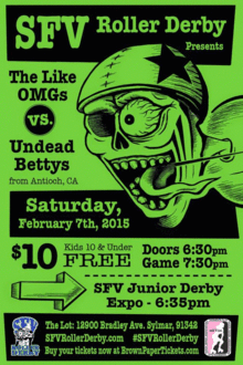 Saturday, February 7, 2015 12900 Bradley Ave. Sylmar, CA Doors: 6:30 pm 6:35pm - SFV Jr. Roller Derby Expo 7:30 pm - Like OMGs vs. Undead Bettys