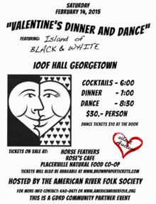The American River Folk Society is putting on the second annual Valentine Dinner Dance on February 14 beginning at 6 pm in the IOOF Hall in Georgetown. There will be a cocktail hour from 6 to 7 pm, where fine crafted beer and wine will be available along with the signature cocktail of the evening, a 'Berry French Kiss'. A sit down dinner will be served beginning around 7 pm with an entrée choice of filet of beef with blackberry wine sauce, roasted chicken wrapped in prosciutto and sage, or pasta with seasonal vegetables in a white wine sauce (vegetarian), all prepared by Nadia Buchwald. The dress is a causal but if you want to wear your fancy duds then dress to impress. After dinner around 8:30 pm the Island of Black and White will take the stage to play their magical music that will get you tapping your toes, and dancing the dinner calories away. Tickets for the Dinner Dance are $30. There are a limited number of tickets available and last year we sold out. There will also be a silent auction where you can pick us something nice and special for your sweetie. This is a benefit for the American River Folk Society's many programs (www.AmericanRiverFolk.org) and is a GDRD community partner event.