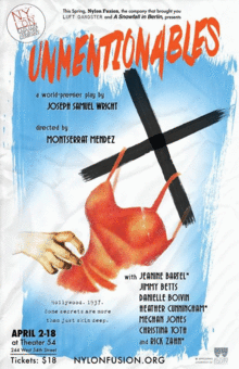 Part shameless exposé of the darker side of the California sunshine, part comedy of manners set in the gears of the 1930s Hollywood dream machine, with familiar echoes in our current celebrity obsessed culture, and in part an homage to the fast talking films of the era, Unmentionables is in turns bitingly funny and heart wrenching, as LA power brokers and those who depend on them for their lives maneuver to get what they want while trying to keep their secrets secret.