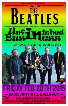 In this Tribute to The Beatles Show, the Central Coast based '60s Rock and Roll band Unfinished Business will give a live performance of approximately 40 hit songs made famous by the greatest band of all time. This show also commemorates and celebrates the 51st anniversary of The Beatles' first appearance on the Ed Sullivan Show in 1964, an event that changed music history and American culture forever. This will be a concert, but dancing and dressing in the style of the '60s, even like the Beatles, is encouraged, as well as everyone singing along with Unfinished Business to some of the best songs of all time.