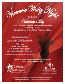 This Valentine's Day at 5:30, we'll be celebrating an enchanted evening of romance by filling the Kona Ballroom at the Hilton Waikoloa with Viennese music, food, wine, and dance. We will be performing many traditional Strauss waltzes, including well-known favorite "The Blue Danube", as we serve pupus and wine, and host a silent auction to raise money for our organization.