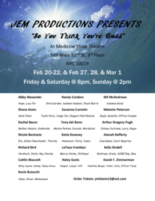 An original play written, directed & produced by Jeffrey E. Milstein's company, JEM Productions13. Jeffrey's production company has shown a serious play "A Moment In Time" & a comedy "The Private Dick" last year. His new play "So You Think You're Godd" is a comedy about what goes on in heaven, it will be presented over two weekends, Feb 20-22, Feb 27, 28 & Mar 1. Friday & Saturday @ 8pm, Sunday @ 2pm.