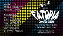 It's all in the name "Fatopia" is a comedy showcase brought to you by Reggie Wade and Rocco Deserto of Big Boned Productions. "Fatopia" will literally and figuratively bring you the biggest up and coming stand up comics on the scene. The show is large and in charge, and will prove that once you go fat, it's pretty hard to go back.
