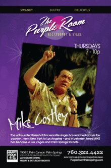 MIKE COSTLEY has shared stages with such musical giants as TONY BENNETT, KEELY SMITH, JOE WILLIAMS, JERRY VALE, DICK CONTINO, GLEN CAMPBELL, VIC DAMONE, ERNIE McDANIELS and JACK JONES. He has been the opening act for comedy giants like DON RICKLES, PAT COOPER, PAT HENRY, JOAN RIVERS and JAY LENO. MIKE has also been extended the honor of signing for the PRESIDENT and MRS. GERALD FORD.