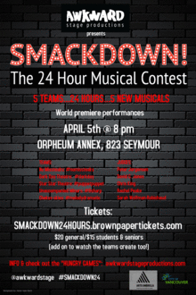SMACKDOWN! The 24 Hour Musical Contest is an extraordinary event where talented teams of performance artists, writers and musicians are given 24 hours to write, stage and perform a musical from scratch. Teams will be given a piano and a rehearsal room and a few 'surprise' elements they must incorporate into their creation. At stake are prizes, bragging rights and the grand prize of $500 with a commitment from Awkward Stage Productions to develop the winning musical! A panel of local theater notables will be the judge!
