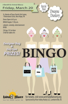 Animal Alliance is hosting it's first ever Bingo night and it's sure to be a hit! We've got local celebrity DWAYNE DUNLEVY geared up to call the numbers and entertain us all. For 10 rounds of BINGO the lucky winners will walk away with posh Designer Handbags and luxurious Spa Packages. All proceeds from the event benefit the life saving programs at Animal Alliance of NJ.