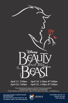 Legacy Christian Academy invites you to step into the enchanted world of Broadway's modern classic, Disney's Beauty and the Beast. Four simple words begin the story, and those words take us to a magical world "Once Upon a Time." The narrator continues to tell of a handsome prince who is selfish and unkind. An Enchantress tries to teach him simply: "beauty is found within." Upon the prince's refusal to accept that lesson and those different from him, he is cursed with a spell and is transformed into a hideous beast.It is only upon his falling in love with another and that love being returned that the spell can be broken. When Maurice, Belle's father, becomes lost in the woods, he discovers the Beast's enchanted castle and meets other magical characters, Mrs. Potts, Chip, Lumiere, Cogsworth, and Babette. Soon, Belle follows, and the enchanted characters hope Belle will be the one to break the spell. This production includes all the showstopping numbers such as "Be Our Guest" and "Gaston." ALL SALES FINAL. No refunds allowed but ticket date exchanges allowed if available.