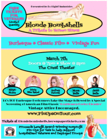 Held Saturday March 7th, 2015 at 7:00pm at the Crest Theater in Westwood, CA "Blonde Bombshells: A Tribute to screen sirens" is a celebration of all things Hollywood glamour. The night will include All-Blonde Burlesque inspired by Hollywoods Classic Screen Sirens. Proceeds from the event go to benefit Award-Winning nonprofit Pin-Ups for Vets to help Support Hospitalized Veterans and Deployed Troops.