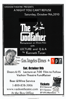 Vashon Theatre Fall fund raiser with Kenneth Turan; Film Critic for NPR & the LA Times (generous Vashon Theatre Patron); will be kicking off this 7:00pm event with a Lecture on the Godfather. Following will be a Special Screening of the Godfather which is has been Re Mastered on 35mm Film. Mr. Turan will close the evening with Q & A. Beer and Wine Service begin at 6:15; when the doors open. Discounted Tickets offered to Vashon Film Society Members.