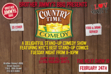 Country Time Comedy is a monthly comedy show snuggled in the heart of a quaint little BBQ restaurant in Union Square. It features the best comedians in all of NYC/the world, and it only costs $5! There is a full service waitress, and drink specials include $3 bud/bud lights. It is always fun, always hilarious, and most importantly, it is always full of tremendous people. Here's this show's lineup. It's ridiculous, in the best way possible...