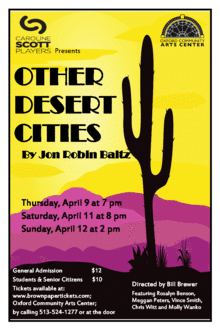 Caroline Scott Players holds its first production, "Other Desert Cities" by Jon Robin Baitz on April 9, 11 and 12 in the Oxford Community Arts Center's north parlor. This Broadway drama is about the Wyeth family gathering in Palm Springs, California for the Christmas 2004 holiday. Brooke Wyeth, the daughter of Polly and Lyman, returns home and announces to the family that she is publishing a memoir dredging up a pivotal and tragic event in the family's history wound they do not want reopened.